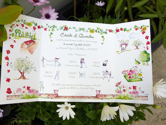 Faire-part invitation Champêtre triptyque Cœur de Vigne Coquelicots